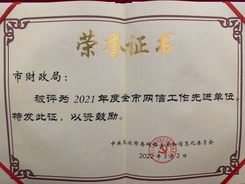 3月2日,全市网信工作会议召开。会议传达了全国网信办主任会议、全省网信工作会议精神,宣读了市委书记、市委网络安全和信息化委员会主任张永霞同志对全市网信工作的批示,总结了2021年全市网信工作,安排部署2022年重点工作任务,对2021年网信工作先进县区、单位和个人进行了表彰,并对有关天水市网络宣传支持单位和网络安全技术支撑单位授牌。天水市财政局荣获“2021年度全市网信工作先进单位”荣誉,1名个人荣获全市网信工作先进个人。
