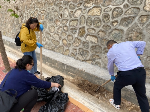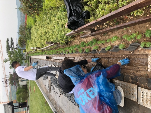 公司新入职员工集中对项目示范园卫生进行清理,大家以培训小组为单位,拔除园内杂草,擦拭石碑、雕塑等园内建筑,冲洗路面及排涝渠内铺设的石子,重点对环路一侧排涝设施进行了清理整治。