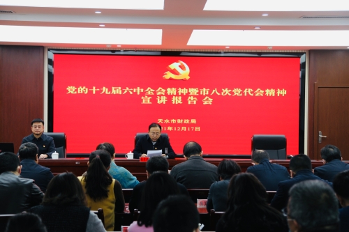 为深入贯彻落实党的十九届六中全会精神和市第八次党代会精神,把我们党百年奋斗重大成就和历史经验学深悟透,持续深化党史学习教育,以伟大的建党精神指引“十四五”开好局、起好步。12月17日上午,市财政局举办党的十九届六中全会精神暨市第八次党代会精神宣讲报告会,邀请市委讲师团成员、天水市“七五”普法讲师团成员、天水市“十四五”规划专家组成员、中共天水市委直属机关工委副书记吴和平同志作专题宣讲报告。局党组书记、局长张宪泉主持会议,局领导班子成员、全体党员干部一百余人参加会议。