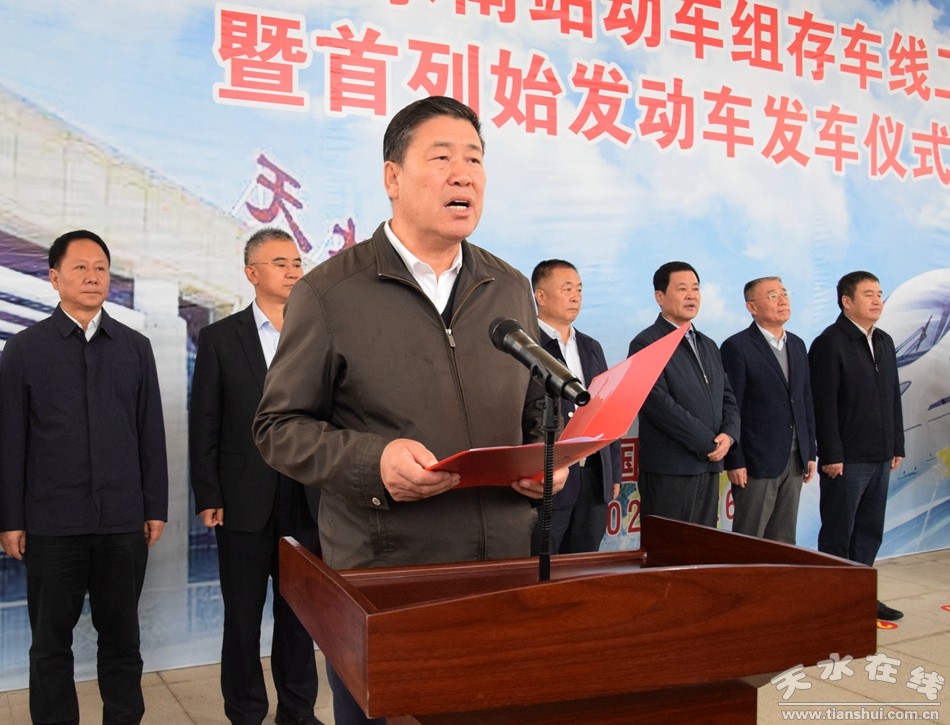 王军在讲话中向为工程建设做了大量工作、付出辛勤汗水的省发展改革委、兰州铁路局集团公司、兰新铁路甘青公司、中铁21局集团公司、市直相关单位、麦积区委、区政府和有关乡镇、村,以及支持工程建设的广大群众表示衷心的感谢。他说,天水南站动车组存车线的建成,对于加快构建天水铁路“十字”骨架、完善陇东南铁路运输组织体系等具有重要意义,也必将为决战脱贫攻坚、决胜全面小康社会等方面起到有力推动作用。全市上下要以此为契机,充分发挥我市作为陇东南交通枢纽的区位优势,进一步加快交通基础设施建设,完善交通运输体系,以交通事业的大发展推动经济社会高质量发展。各相关县区和部门要抓住天水南站动车组存车线始发动车的历史机遇,让高铁这一现代化交通更好地造福广大群众,助力我市经济社会发展。要进一步加强衔接沟通,在始发天水—兰州动车的基础上,力争年底始发天水—西安动车。要用好高铁资源,加大宣传推介,做大做强文化旅游首位产业,推动文化旅游市场蓬勃发展。要层层靠实责任,严格落实人防技防措施,确保安全存车、安全运营。要强化服务保障,加强高铁站周边安全隐患和环境卫生治理,为铁路运输创造安全规范的运营环境。