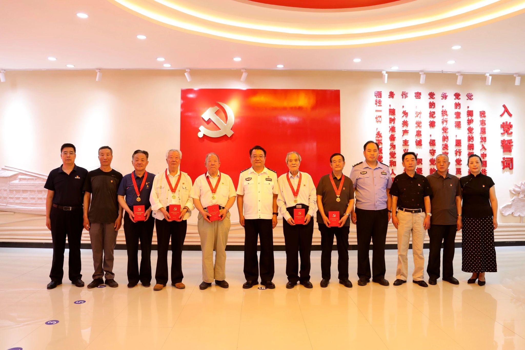 颁发仪式上,郭庆祥同志逐一为获得纪念章的老党员佩戴“光荣在党50年”纪念章,并代表市局党委向老同志们致以热烈祝贺和崇高敬意。他指出,老党员是党的事业的亲历者、践行者、奉献者,他们五十载初心不改,将青春融入强警征程,用忠诚捍卫了国家安全和社会稳定,用执着初心坚定守护了一方平安和百姓安宁,谱写了“人民至上”的时代赞歌,为天水公安事业的长远发展奠定了坚实基础。政治部和机关党委要持续做好各项服务保障工作,让老党员老有所养、老有所为、老有所乐。同时也希望老党员们继续发挥“传帮带”作用,持续关注关心天水公安事业发展,为维护天水社会稳定、人民安居乐业积极建言献策。