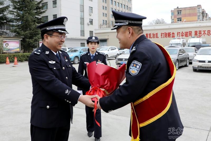 下午3时,身披“甘肃省先进工作者”绶带、胸别荣誉奖章的漆天生阔步走进市公安局大门,市公安局党委班子成员、相关部门负责人和秦州分局有关领导、民警代表上前迎接,为他献花并合影留念。