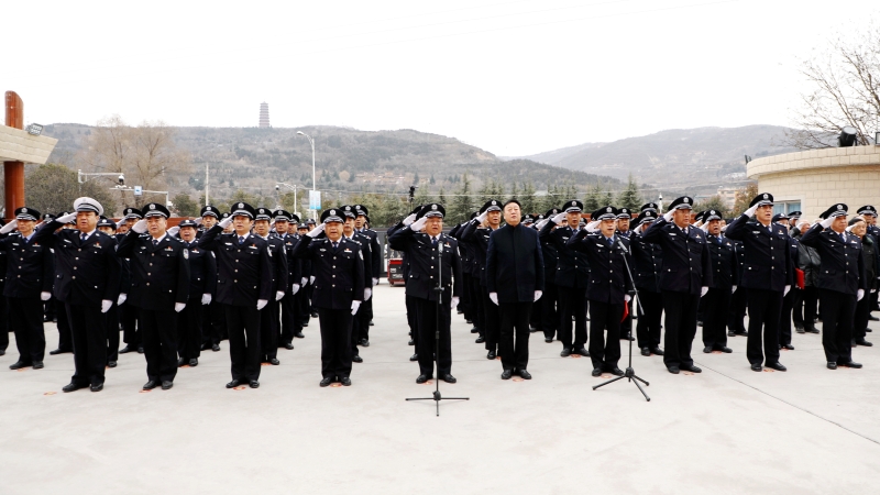 郭庆祥强调,全体民警要紧紧团结在以习近平同志为核心的党中央周围,高举习近平新时代中国特色社会主义思想伟大旗帜,增强“四个意识”、坚定“四个自信”、做到“两个维护”,始终以党的旗帜为旗帜,以党的方向为方向,以党的意志为意志,将忠诚的政治基因铸于警魂、融入血脉,让旗帜引领火热的实践,让使命点燃奋斗的激情;始终以警旗为指引,铸魂强基、擎旗奋进,以最强党性铸就忠诚之盾,以最严措施织密安全之网,以最硬作风恪尽维稳之责;始终以训词为号令,牢记嘱托、感恩奋进,高扬奋进之志、激荡奋进之力、永葆奋进之姿,全力护航山川秀美新甘肃建设,奋力谱写新时代天水公安工作新篇章,以忠诚使命、担当作为向党和人民交上一份满意的答卷。