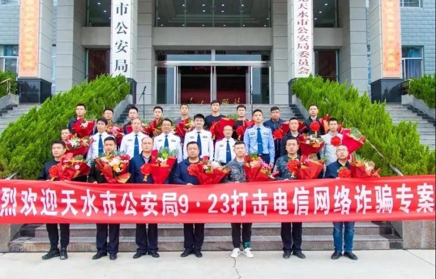 9月27日上午,天水市公安局隆重举行市公安局“9·23”打击电信网络诈骗专案组凯旋欢迎仪式。公安部刑侦局二级巡视员郑翔、省公安厅一级警务专员刘琪基、省公安厅刑侦局总工程师耿小鹏莅临欢迎仪式并对专案民警进行慰问献花,副市长、市公安局党委书记、局长郭庆祥致辞。