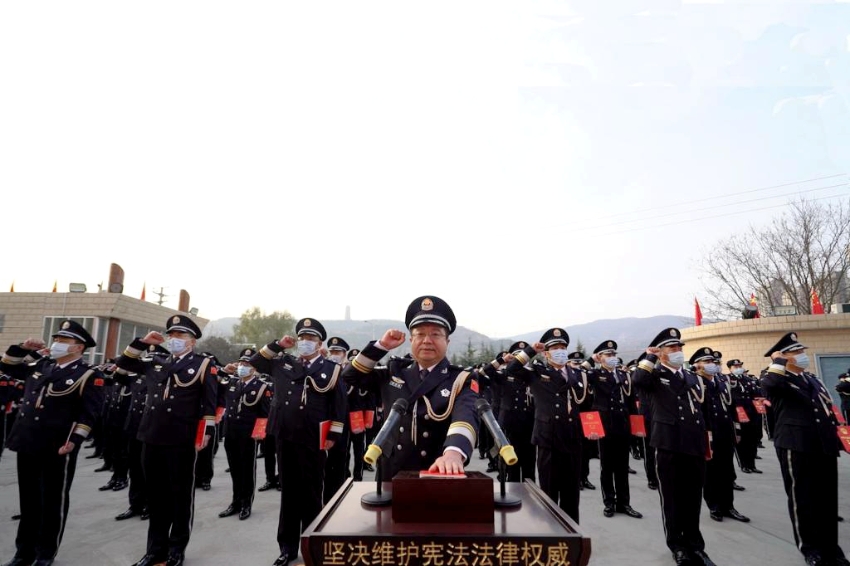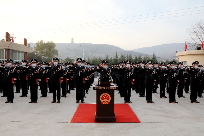 为了深入学习宣传习近平法治思想,贯彻落实中央和省、市关于学习贯彻《中华人民共和国宪法》的通知精神,进一步激励和教育全体民辅警树立宪法意识、维护宪法权威、恪守宪法原则、弘扬宪法精神、履行宪法使命,12月3日上午,在第八个国家宪法日来临之际,天水市公安局举行升国旗暨宪法宣誓仪式。副市长、市公安局党委书记、局长郭庆祥参加活动并领誓。