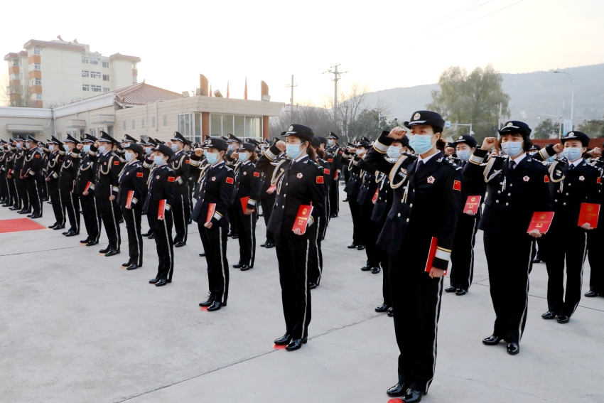 升旗仪式后,郭庆祥同志左手抚按《中华人民共和国宪法》,右手举拳,领诵誓词,全体民警肃立,左手持宪法,右手举拳,庄严宣誓,字字千钧,句句入心,铿锵有力的誓言既是全体民警忠于宪法、维护宪法权威、履行法定职责、忠于祖国、忠于人民,接受人民监督的庄严承诺,又表达了为建设富强民主文明和谐美丽的社会主义现代化强国努力奋斗的决心信心,承载着恪尽职守、廉洁奉公的社会责任感,展现了新时代天水公安队伍的良好精神风貌。