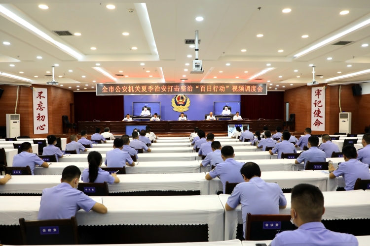 市公安局党委在家班子成员、局属各部门警种主要负责人、市局“百日行动”领导小组办公室全体人员在主会场参加会议,会议以视频形式开至县一级,各分县局相关人员在各自分会场参加会议。