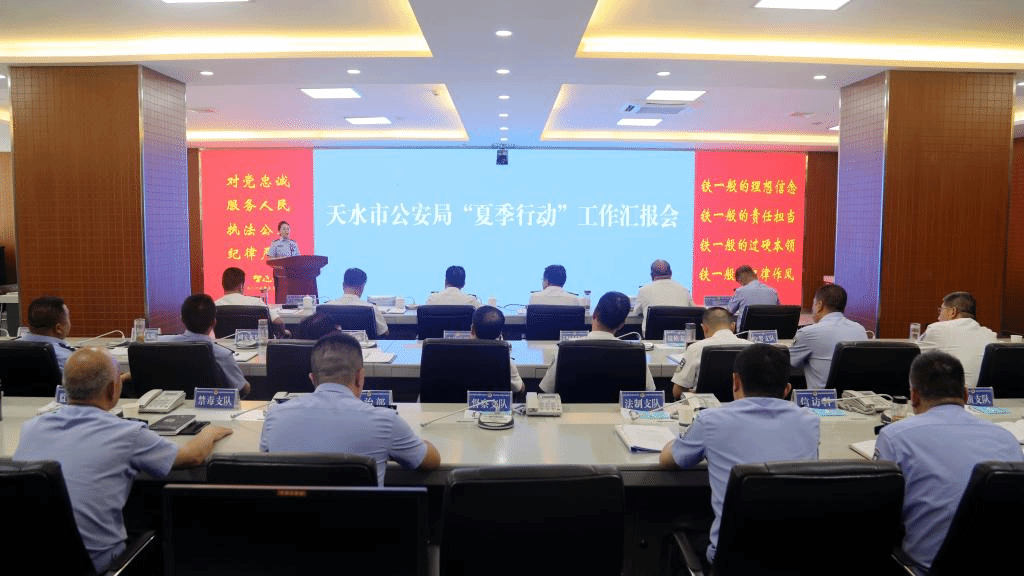 8月3日上午,全省公安机关视频调度会后,天水市公安局召开“夏季行动”工作汇报会,全面贯彻落实省公安厅和市委市政府部署要求,听取市局机关夏季治安打击整治行动进展情况汇报,进一步分析形势、传导压力、靠实责任,就纵深推进“夏季行动”,牵引带动整体公安重点工作奋勇争先、争创一流、走在前列进行再部署再推进。副市长、市公安局党委书记、局长郭庆祥主持会议并讲话,省公安厅陇东督导处副处长王晓路应邀出席会议。