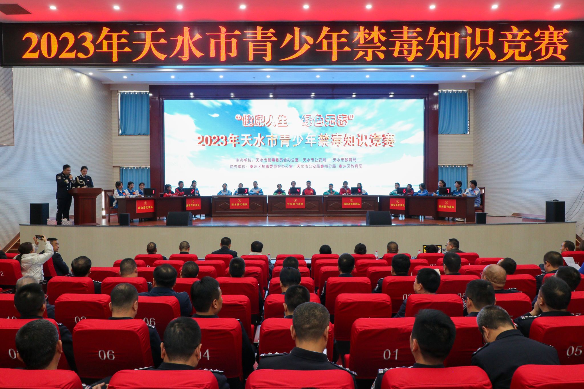 为深入贯彻落实习近平总书记对禁毒工作的指示批示精神,深化青少年毒品预防教育工作,巩固学校毒品预防教育成果,增强在校学生识毒防毒拒毒意识能力,11月24日,由天水市禁毒委员会办公室主办、市教育局协办、秦州区禁毒委员会办公室承办的天水市2023年青少年禁毒知识竞赛在市公安局秦州分局礼堂举行。市委常委、政法委书记、市禁毒委副主任邵建斌出席活动并讲话。市人大常委会副主任、市禁毒委副主任申君明,市政协副主席、市禁毒委副主任崔玉军为获奖代表队颁奖。