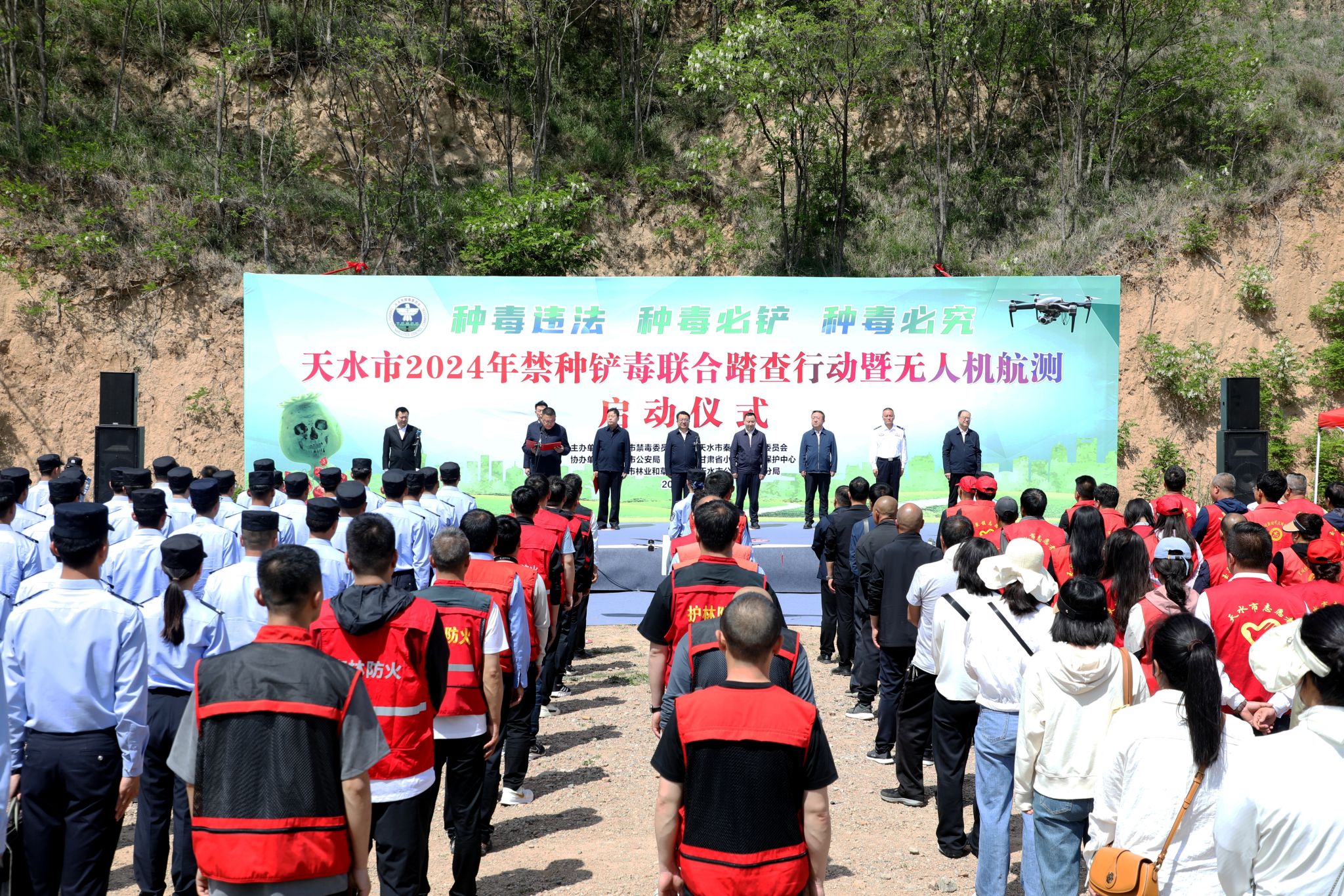 省小陇山林业保护中心、省第四强制隔离戒毒所、市委政法委、市林业和草原局、市公安局和秦州区有关负责同志出席仪式,并为公安民警、林业干部、乡镇街道干部、志愿者和无人机方队授旗。