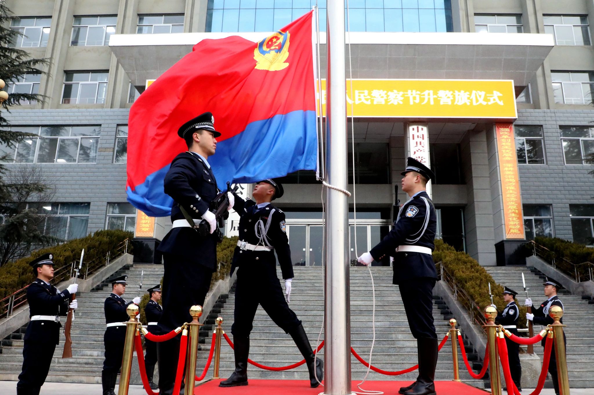 “正步走!”伴随着指挥员洪亮的口令,仪仗队员迈着铿锵有力的步伐,将警旗护送至升旗台。“向警旗——敬礼!”嘹亮的《中国人民警察警歌》奏响,擎旗手将警旗高高扬起,全体民警庄严敬礼、齐唱警歌,鲜艳的警旗沐浴着清晨的阳光冉冉升起、迎风飘扬。