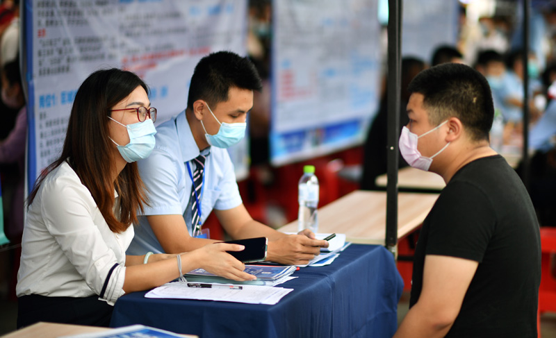 4月18日,在海口市举行的“战疫情·促就业”大型综合性招聘会上,用人单位与求职者现场交流。在做好疫情防控工作的前提下,此次招聘会邀请了100多家企业参加,提供就业岗位4000个。新华社记者 郭程 摄
