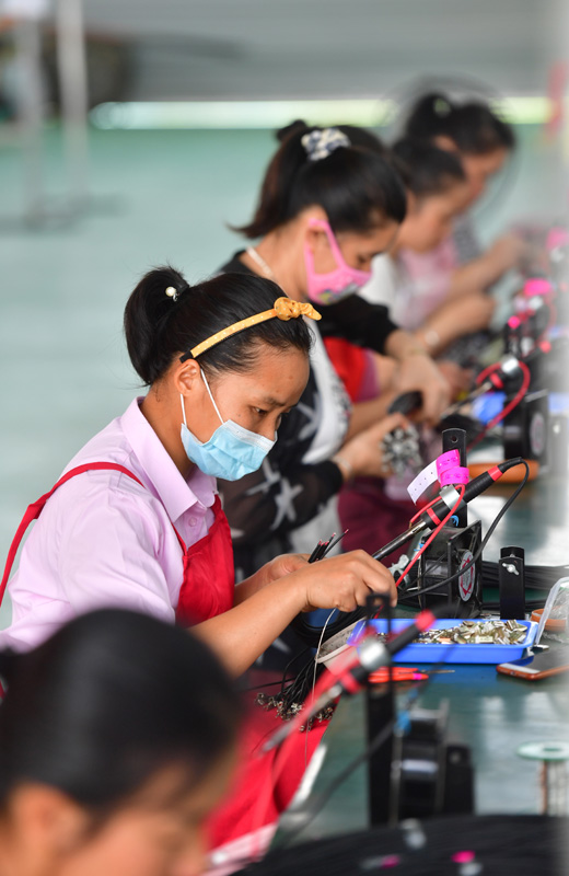 5月17日,在广西融安县农产品加工暨粤桂扶贫协作产业园,一家电子产品企业的工人在扶贫车间生产线上作业。新华社记者 黄孝邦 摄