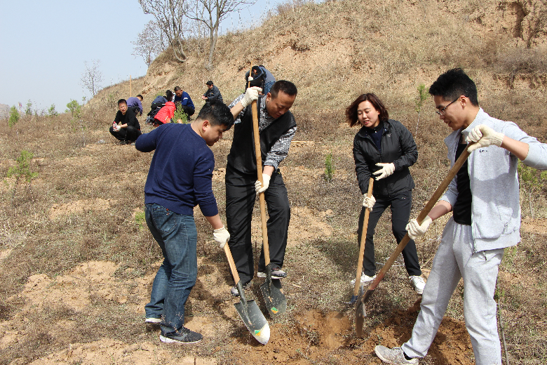 干部职工个个争先恐后进入植树点,两三个人一组,忙得不亦乐乎。挖坑、扶苗、培土、踩实……大家将一锹锹泥土,回填到一株株树的根部,然后又细心地踩实,再填土,再踩实围墩,细致认真地完成每一道工序,确保栽一棵新苗,增一片新绿。大家分工协作,齐心协力,一棵棵新栽种的树苗迎风而立,千余株小树苗伫立在田间,放眼望去,一排排生机盎然的树木迎风而立,为大地添绿增色。