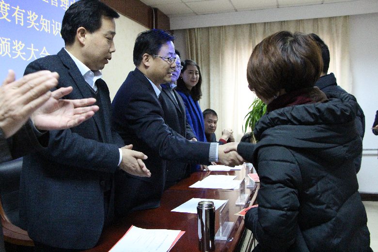 中心总会计师秦毅学介绍了本次有奖知识竞赛开展情况。胡旭宣布中奖名单,出席颁奖仪式的领导向中奖人员颁发奖金。中奖人员代表发表了获奖感言。