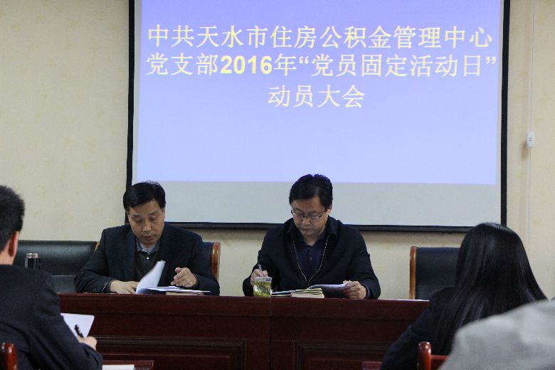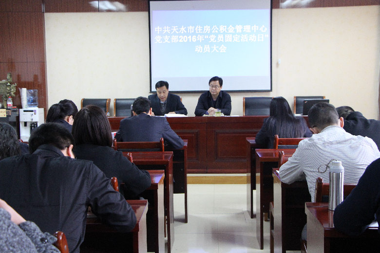 3月4日下午,天水市住房公积金管理中心党支部召开“党员固定活动日”专题学习教育活动,中心党组书记、主任张长平,党组成员、副主任杨志炜及全体党员和入党积极分子35人参加了学习活动。 会议集体传达了市委组织部关于“两学一做”学习教育的通知,市直机关工委【关于印发《市直机关基层党组织“党员固定活动日”实施方案》的通知】,学习了《中国共产党章程》总纲部分,研究讨论了市公积金管理中心党支部《关于开展党员固定活动日的实施方案》。