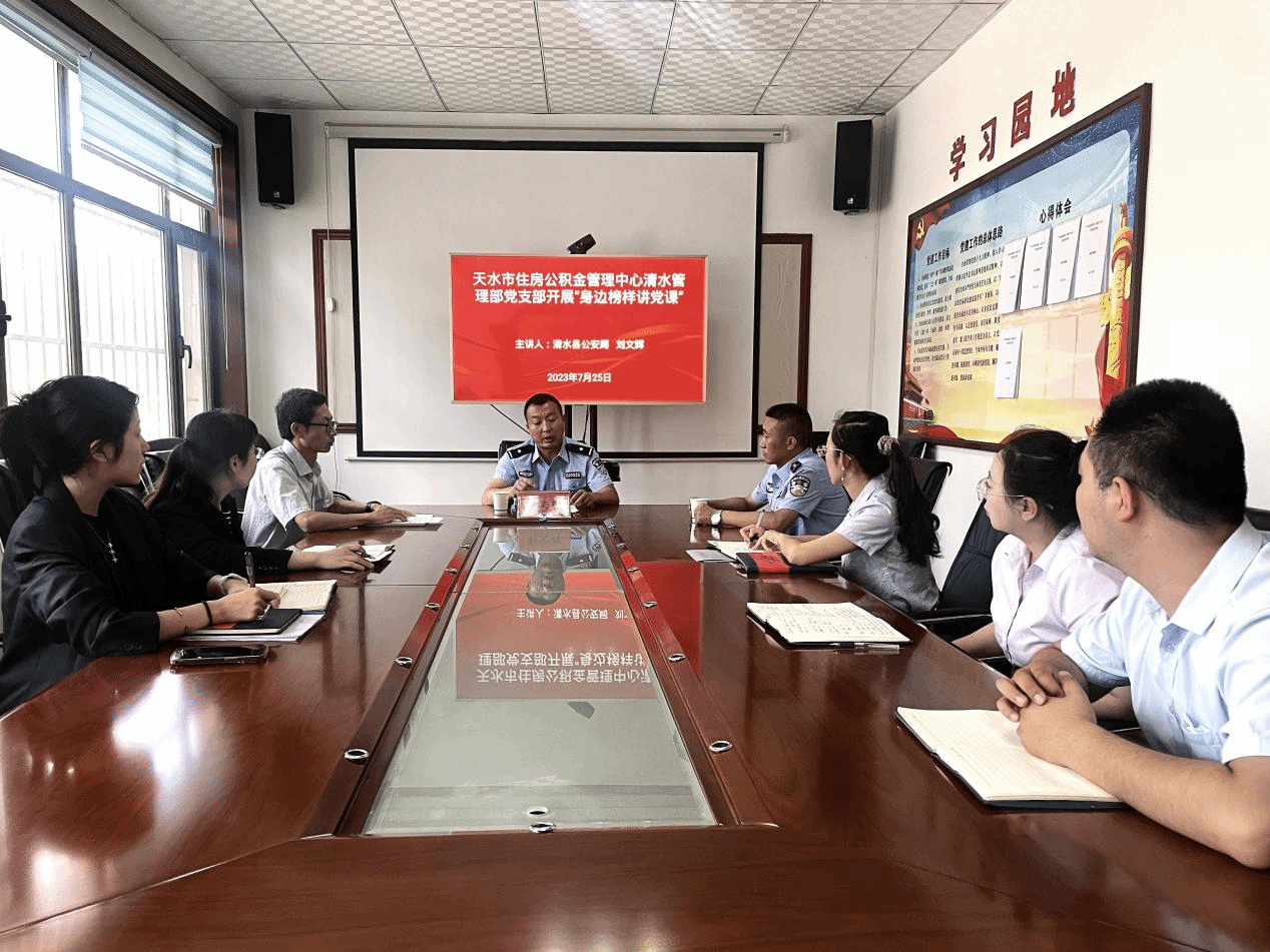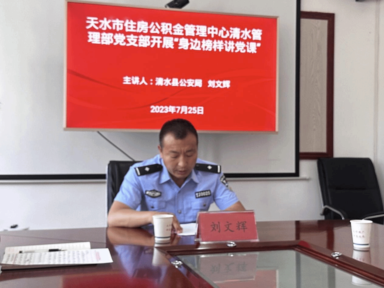 7月25日下午,天水市住房公积金管理中心清水管理部党支部开展“身边榜样讲党课”活动。邀请清水县公安局民警刘文辉同志讲述他在公安局工作和部队服役期间完成重大任务的先进事迹,尤其是在2008年5月12日四川汶川特大地震发生后第一时间冒着生命危险去灾区现场抗震救灾的感人事迹。