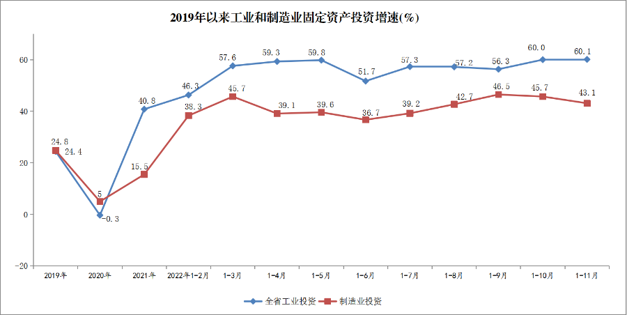 1-11月,全省工业固定资产投资同比增长60.1%,较上年同期提高23.7个百分点,较1-10月提高0.1个百分点,继续保持高速增长态势。