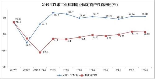 1-10月,全省工业固定资产投资同比增长31.8%,增幅与上月持平,较上年同期增长34.3个百分点。