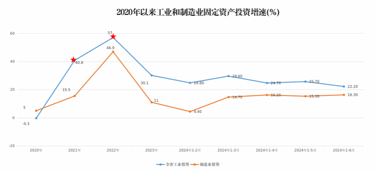 1-6月,全省工业固定资产投资同比增长22.2%,位居全国第4位,增幅较上年同期回落21.1个百分点,较2024年1-5月回落3.5个百分点。