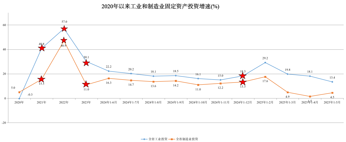 2025年1-5月,全省工业固定资产投资同比增长13.4%,超出全国平均水平(11.6%)1.8个百分点,高于调度目标(10%) 3.4个百分点,位居全国第15位,增幅较上年同期回落12.3个百分点,较2025年1-4月回落4.7个百分点。