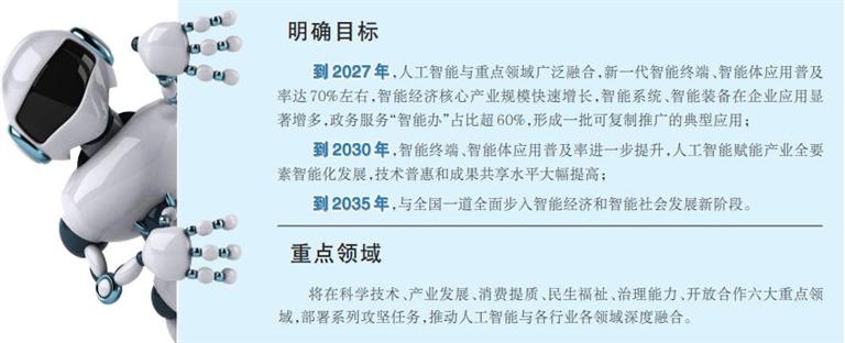 《方案》聚焦科学技术、产业发展、消费提质、民生福祉、治理能力、开放合作六大重点领域,部署系列攻坚任务,推动人工智能与各行业各领域深度融合。