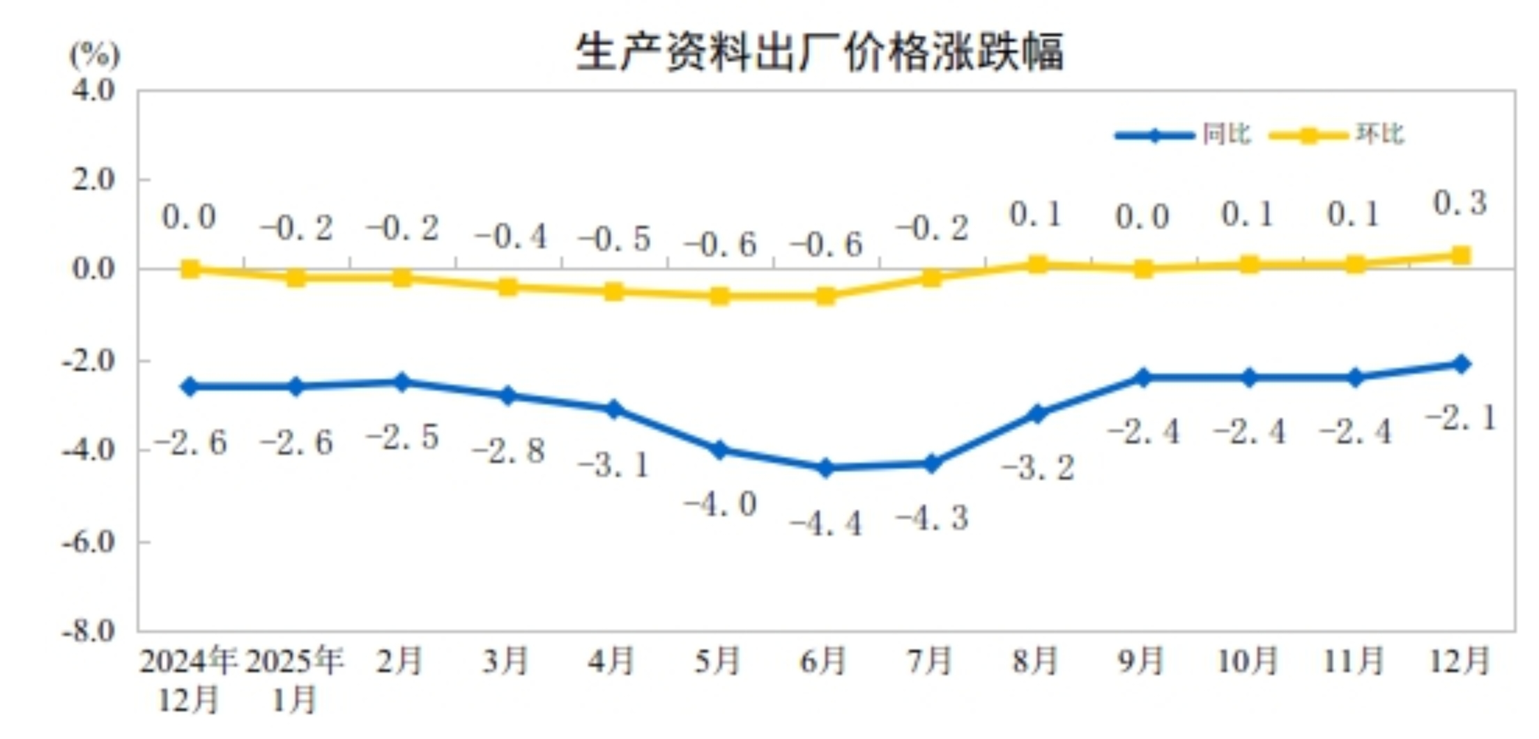 2025年12月份,全国工业生产者出厂价格同比下降1.9%,降幅比上月收窄0.3个百分点;环比上涨0.2%,涨幅比上月扩大0.1个百分点。工业生产者购进价格同比下降2.1%,降幅比上月收窄0.4个百分点;环比上涨0.4%,涨幅比上月扩大0.3个百分点。2025年全年,工业生产者出厂价格下降2.6%,工业生产者购进价格下降3.0%。