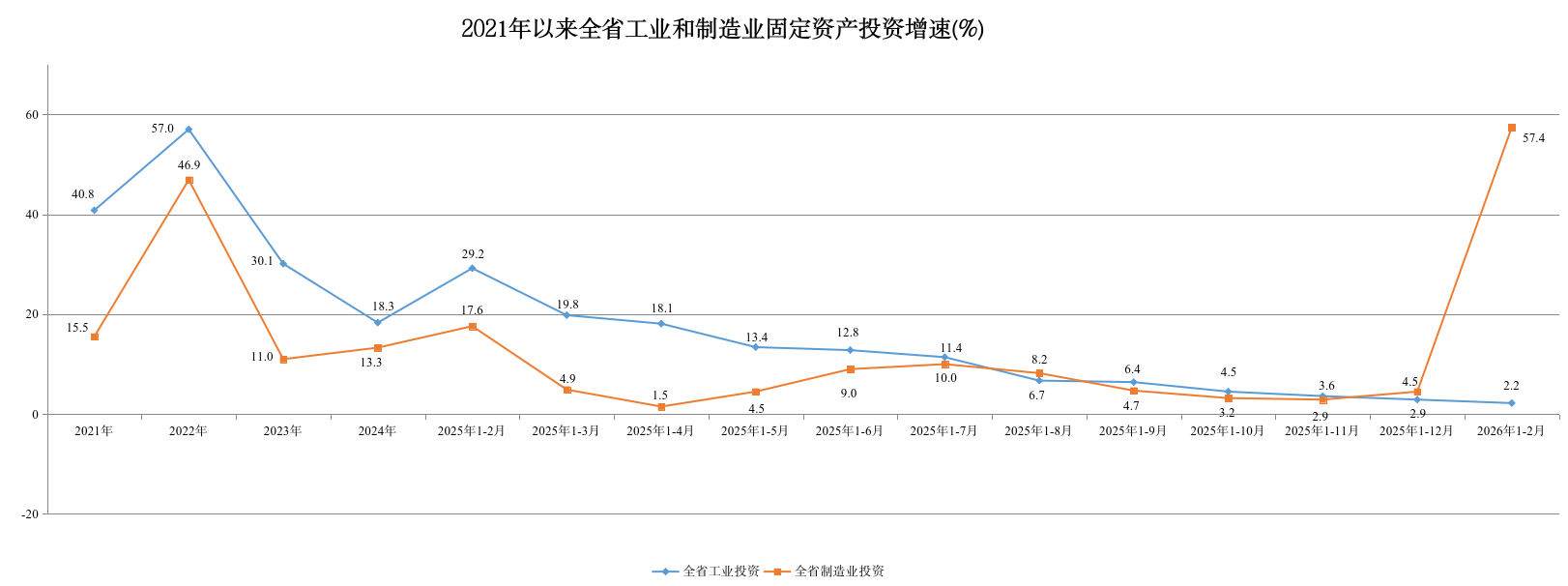2026年1-2月,全省工业固定资产投资同比增长2.2%,低于全国平均水平(5.4%)3.2个百分点,位居全国第20位,增速较上年同期回落27个百分点,较2025年1-12月回落0.7个百分点。