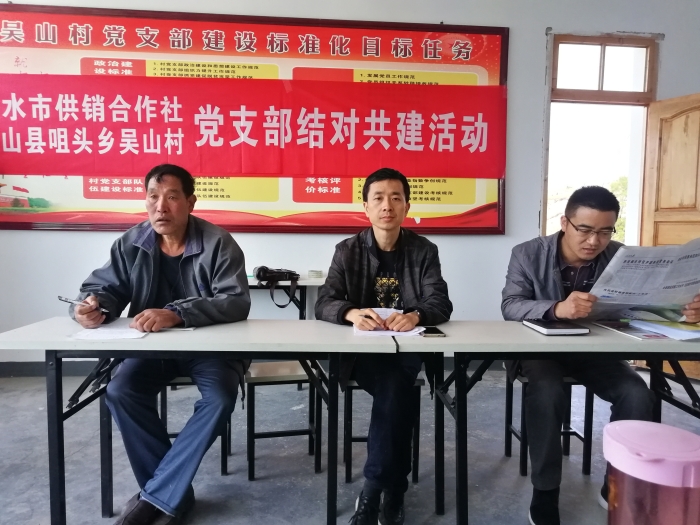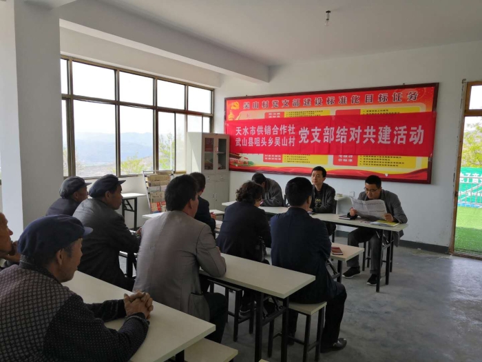 5月10日,市供销社党支部和帮扶村武山县咀头乡吴山村党支部联合开展5月份“主题党日”,落实结对共建相关文件精神。市供销社把扎实开展脱贫攻坚问题彻查整改冲刺清零行动作为抓党建促脱贫攻坚的具体体现,作为5月份“主题党日”核心内容,以结对共建为抓手,集中力量固强补弱、冲刺清零,推动问题整改见底见效。