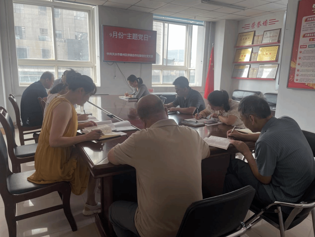 9月12日,秦州区供销社组织召开了9月主题党日活动。组织全体党员学习了习近平总书记近日对党纪学习教育作出的重要指示精神,8月30日召开的中央党的建设工作领导小组会议精神及《中华人民共和国公务员法》及其配套法规《公务员转任规定》;通过学习,引导党员干部在遵守纪律的前提下,勤奋工作、放手干事、锐意进取、积极作为。支部书记就党纪学习教育开展情况作了通报;开展党史、新中国史有关内容的学习宣传教育,组织开展了“庆祝中华人民共和国成立75周年”活动;组织党员自觉、按时、足额交纳了9月份党费。
