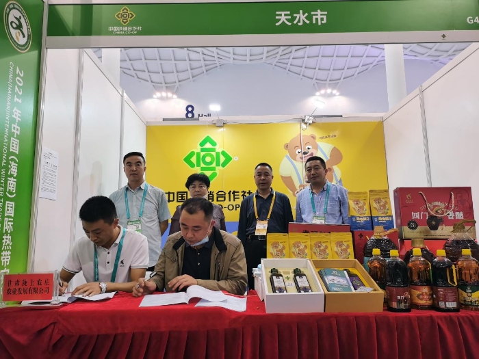 甘肃省供销联社理事会副主任张瑞峰带队参加,组织了10个市州的农副产品参展。天水市社组织系统有实力的特色农产品企业参展,武山的亚麻籽油、四门香醋、天水松子在现场受到了来自全国客商的青睐。甘肃陇上农庄农业发展有限公司、天水幸福里土特产开发有限公司与海南砚悦商贸有限公司签约共640万元,初步搭建起合作桥梁,为宣传推介天水农特产品贡献了供销力量。