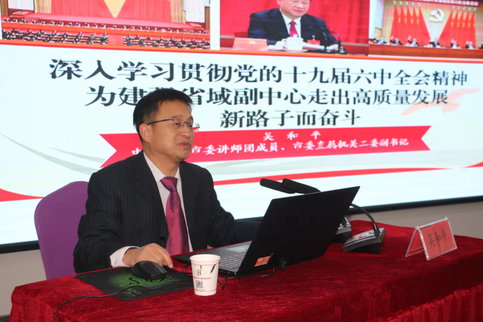 12月20日,市供销合作社邀请市委讲师团、市直机关工委副书记吴和平,围绕党的十九届六中全会精神及市第八次党代会精神,以《深入学习贯彻党的十九届六中全会精神为建强省域副中心走出高质量发展新路子而奋斗》为题进行专题宣讲。市社机关,县区供销社主要领导、分管业务领导和业务骨干,社有企业、部分基层社负责人共计40多人参加。