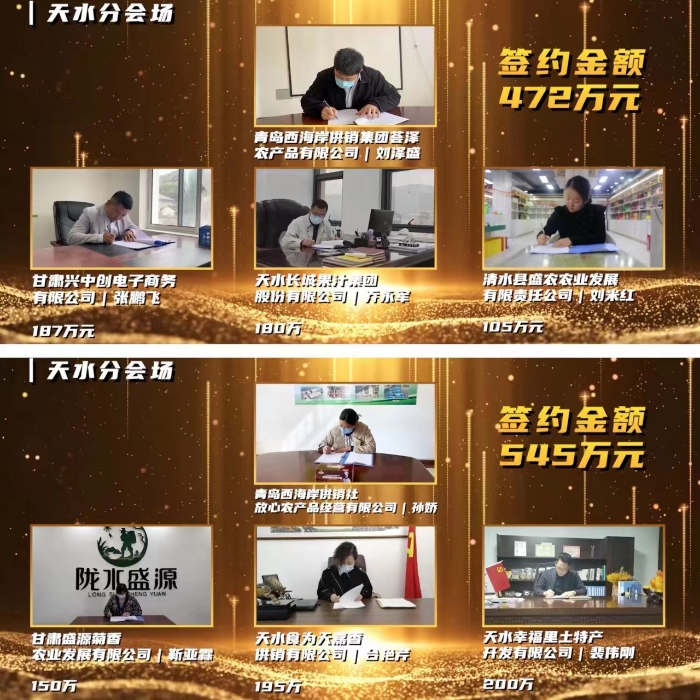 天水市供销联社高度重视,积极参与,精心筹备,组织全市供销系统6家社有企业,20多种农产品参加活动。同时,利用抖音通过“云端”展销对接,为企业牵线搭桥,推介天水的农特产品。活动当天,青岛市2家采购商分别与天水的6家企业就花牛苹果、秦安花椒、天水松子、清水蜂蜜、利桥木耳等进行了线上采购意向协议签约1017万元。通过线上联动,提升天水特色产品供给方与青岛采购方深入互动,有效帮助企业与市场在疫情困难期实现精准对接,初步搭建起了进一步合作的平台。