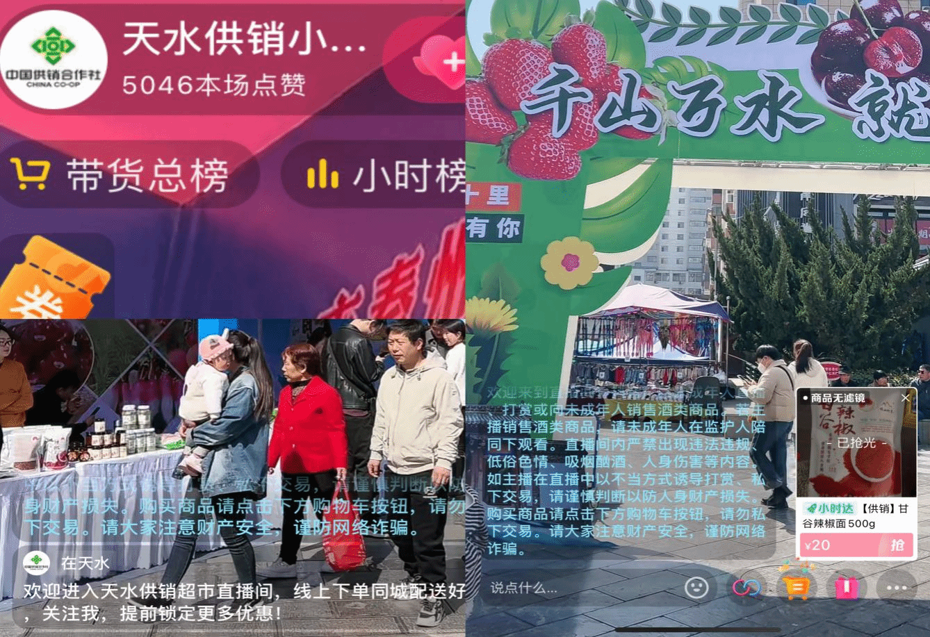 迅速搭台建网,打通销售终端。市供销联社积极推进天水农产品品牌运营中心和电商直播基地建设,充分利用天水供销电商大厦开展农产品展示展销、电子商务培训实训,借助“供销抖音小时达”视频直播,整合优选麻辣烫料理包、专业合作社农特产品等开展线上销售,加大农产品品牌宣传推介力度,拓宽农产品销售渠道和市场空间,推动天水农产品走向大市场、大终端,促进消费帮扶,形成产地和终端、省内和省外、线上和线下、传统媒体和新媒体相结合的联动宣传推广机制。