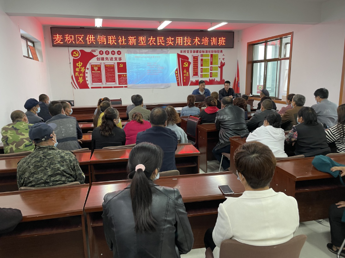 天水市麦积区供销联社结合党史学习教育,开展“我为群众办实事”活动,于9月25日在甘泉镇朝阳村举办了新型农民实用技术培训班。培训班邀请了麦积区高级农艺师科技特派员裴宏州老师进行了实用技术专题培训。