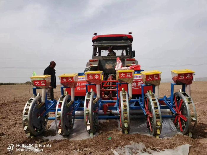 今年,麦积区供销联社积极引领天水市佳禾稼农机服务农民专业合作社流转长期外出务工、家中无劳力的农户连片土地1000亩,建设玉米--大豆复合套种特色种植示范推广基地,提高土地规模化经营和集中连片示范效果。目前,示范推广100亩播种已完成,且已部分出苗,相关记录统计同步推进。大田4行玉米套种2行大豆“4+2”模式正在按计划播种,平均每天播种120亩,预计5月10号完成大面积播种任务,届时进入植保环节。“玉米+大豆”复合间作模式,可以充分发挥两种作物的高度差,有效解决玉米、大豆争地争光问题,实现优势互补,提高作物产量。