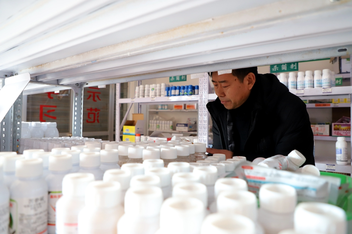 负责人周红红正在对新到货的农药进行仔细检查和分类,确保农户买到优质的产品,享受高效的农资服务。