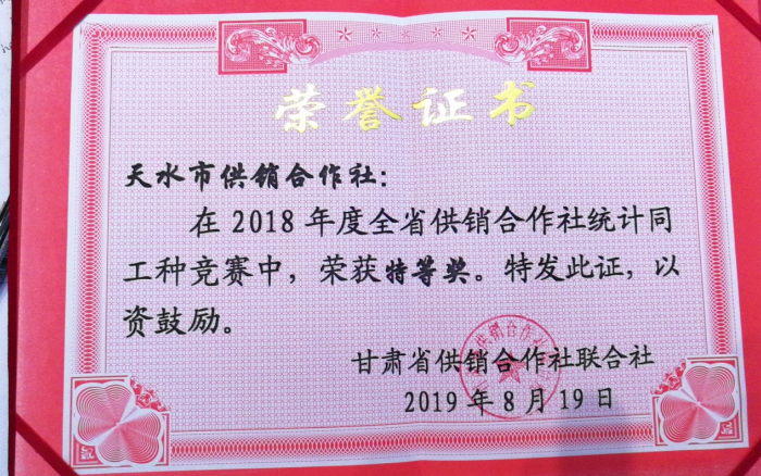 8月23日,全省供销合作社系统统计工作培训会暨经济运行情况分析会在酒泉玉门市召开,天水市供销合作社获得2018年度全系统统计同工种竞赛特等奖,已连续五年获得该奖,秦州区供销合作社联合社获得2018年度县(市、区)供销合作社统计工作先进单位。同时,天水市供销合作社在会上作为题为《提升统计服务功能助力供销经济发展》的交流发言。