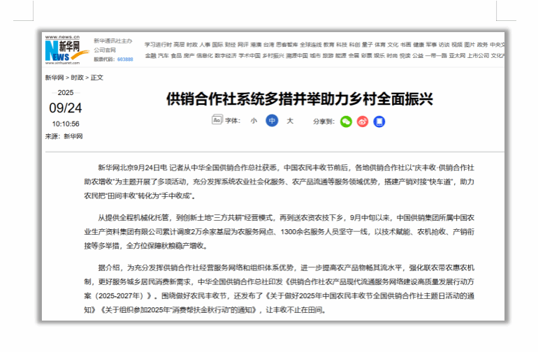 从提供全程机械化托管,到创新土地“三方共耕”经营模式,再到送农资农技下乡,9月中旬以来,中国供销集团所属中国农业生产资料集团有限公司累计调度2万余家基层为农服务网点、1300余名服务人员坚守一线,以技术赋能、农机抢收、产销衔接等多举措,全方位保障秋粮稳产增收。