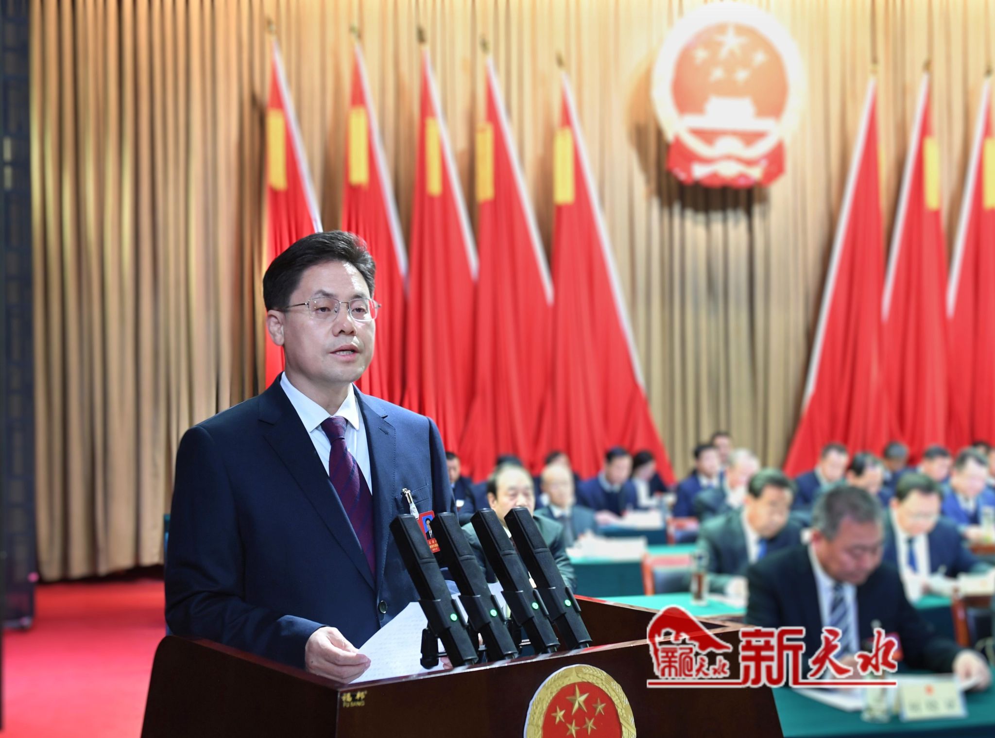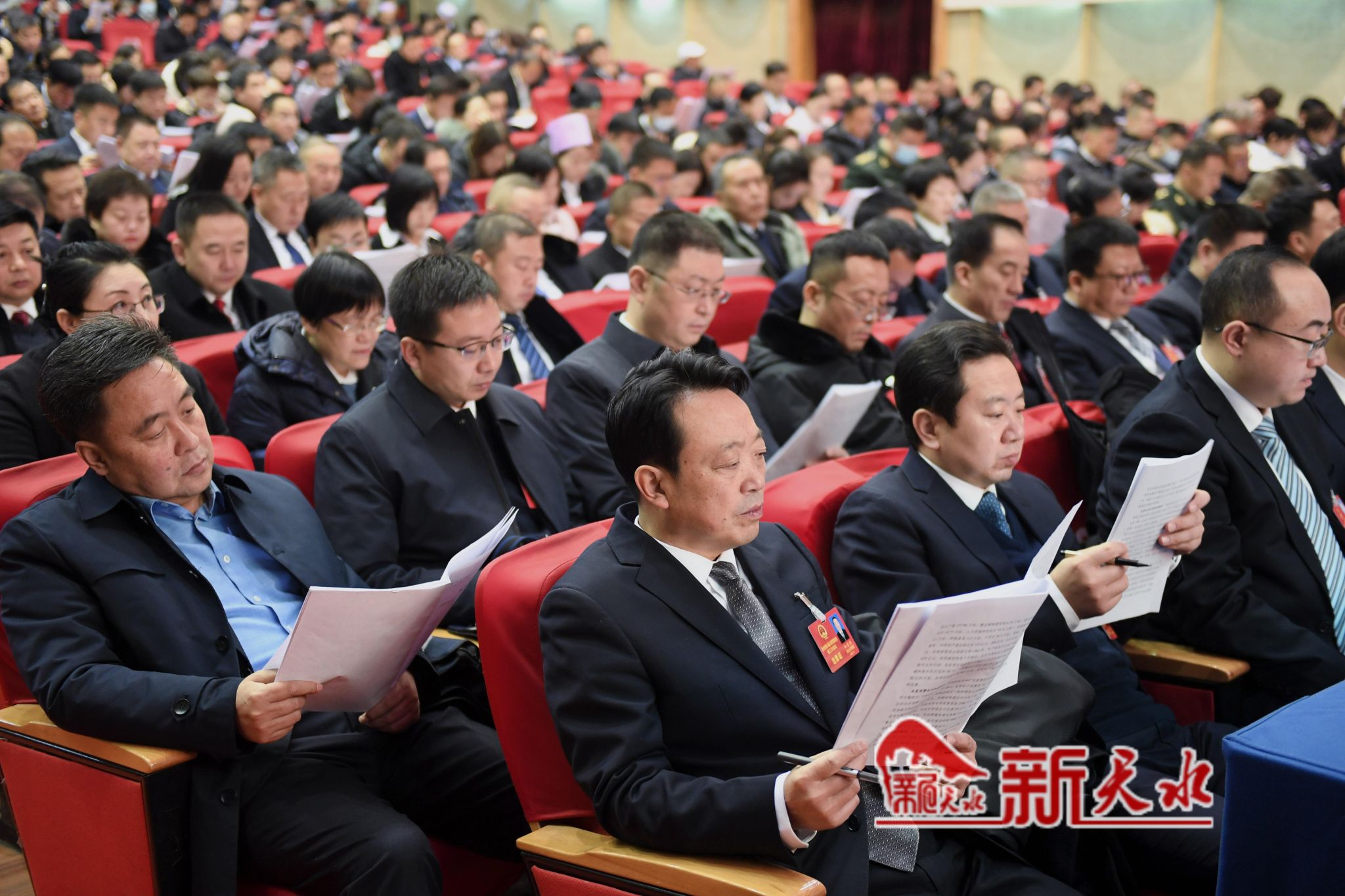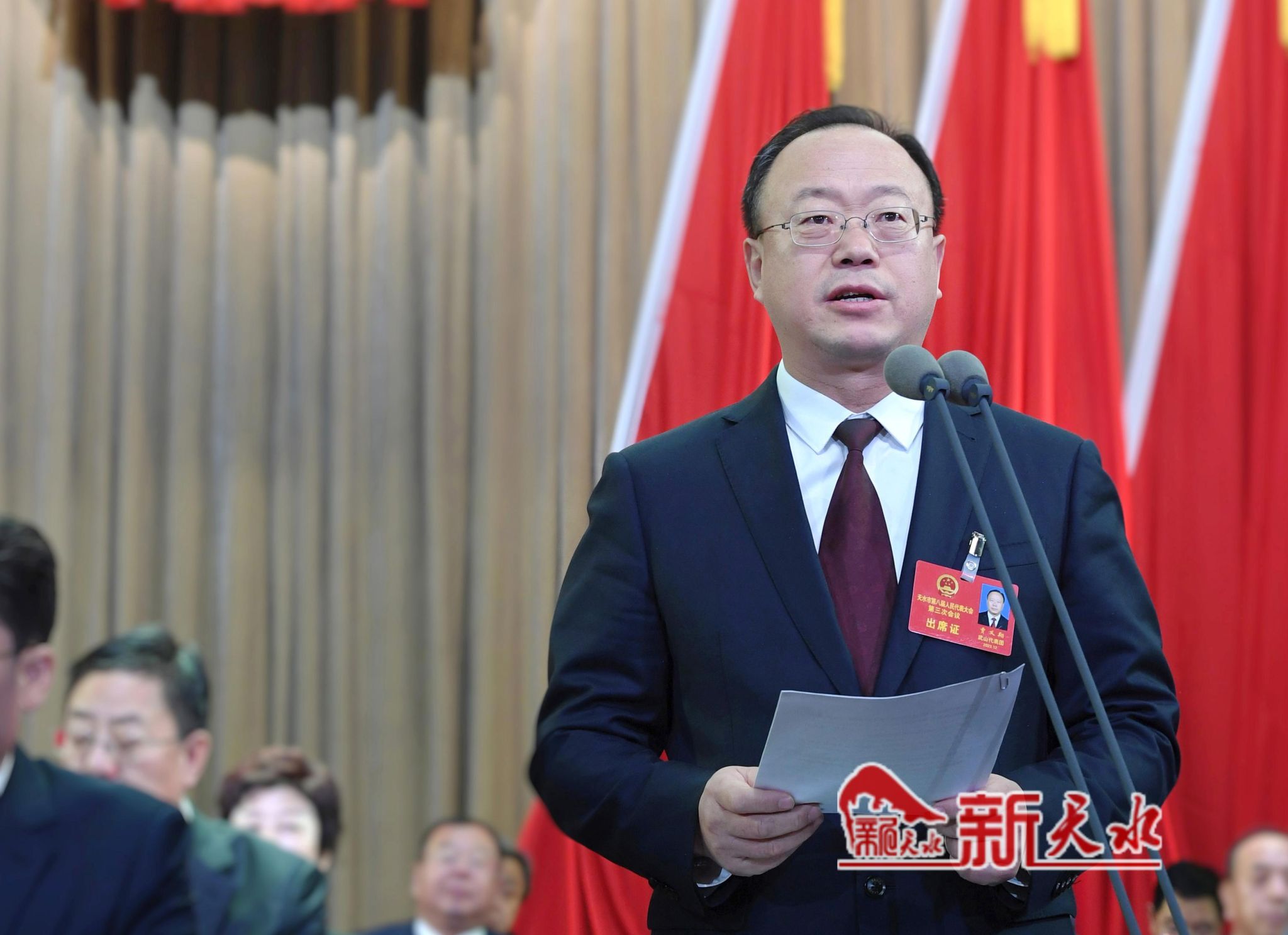 秦州剧院内气氛庄重热烈,主席台帷幕正中的国徽在鲜艳的红旗映衬下熠熠生辉。会场内悬挂着“以习近平新时代中国特色社会主义思想为指导,为谱写中国式现代化天水新篇章而努力奋斗!”的横幅标语鼓舞人心、催人奋进。