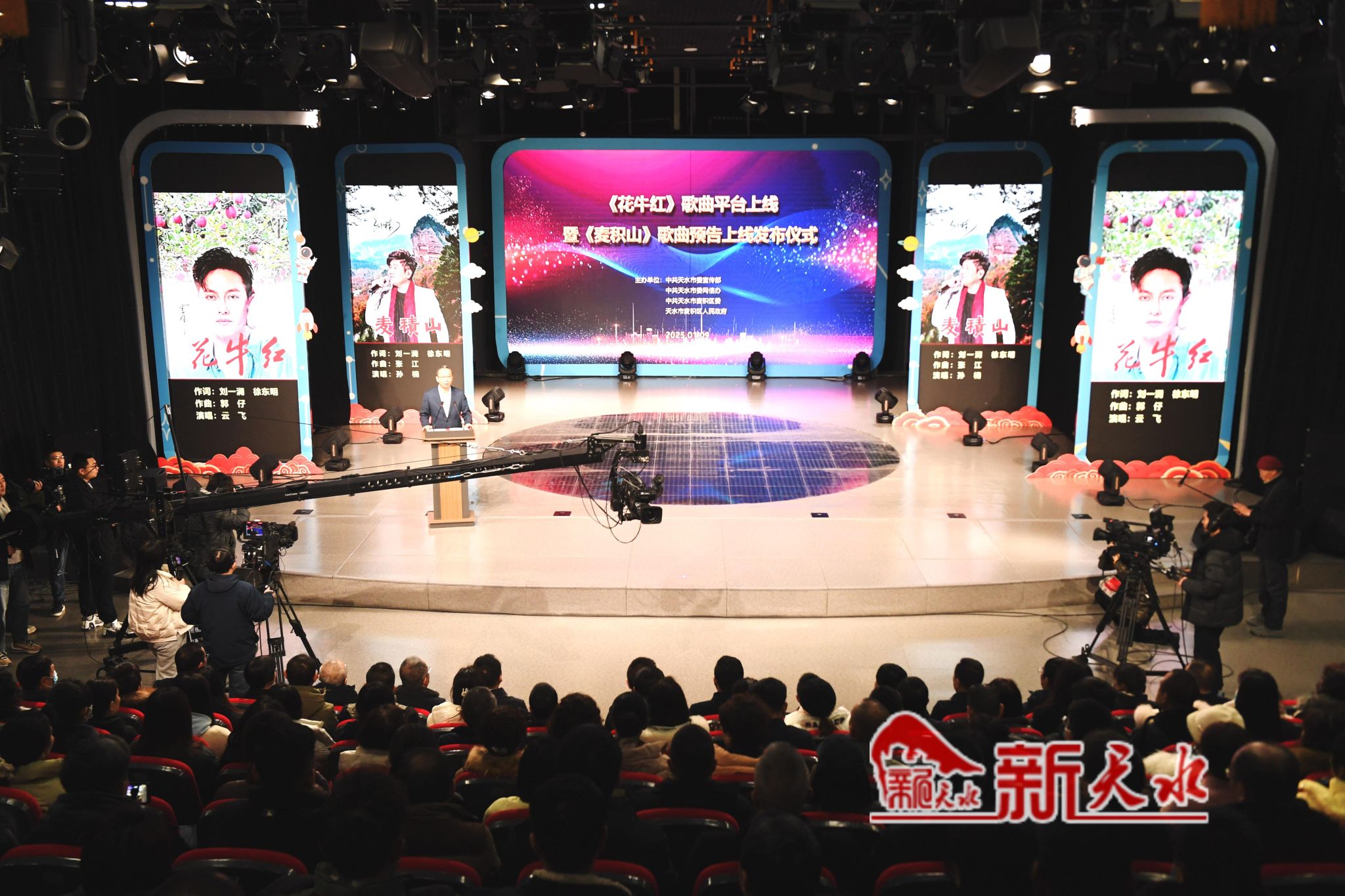 1月9日上午,天水市举行《花牛红》歌曲全平台上线暨《麦积山》歌曲上线预告发布会。市委书记冯文戈,市委副书记、市长刘力江出席发布仪式。