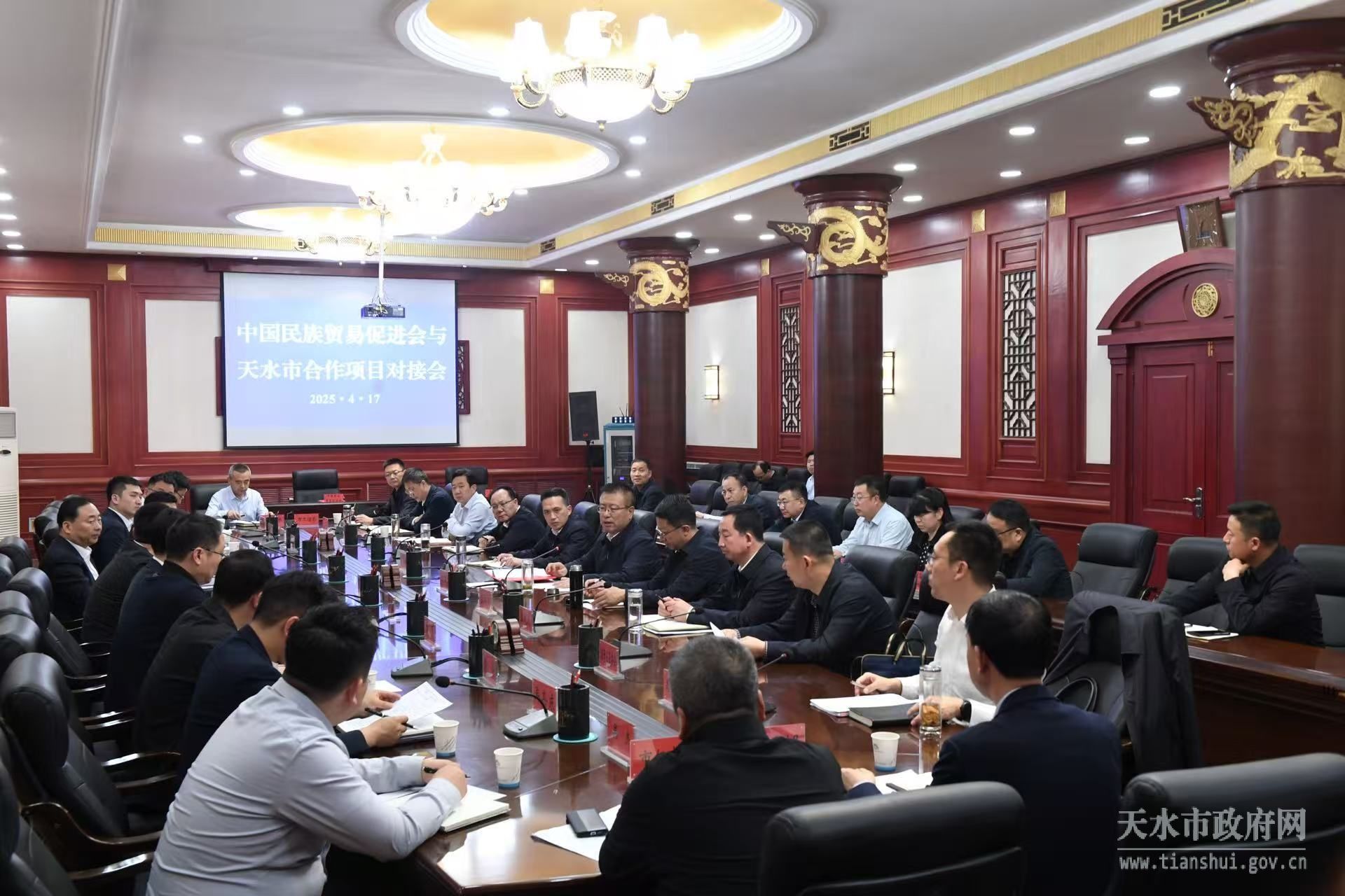 4月17日,市委副书记、市长刘力江主持召开天水市与中国民族贸易促进会合作项目对接会。会上,天水市政府与中国民族贸易促进会签订全面战略合作协议,与会各方围绕“一乡一品”项目建设、新能源产业发展等领域深入进行沟通对接,在多个方面达成合作共识。