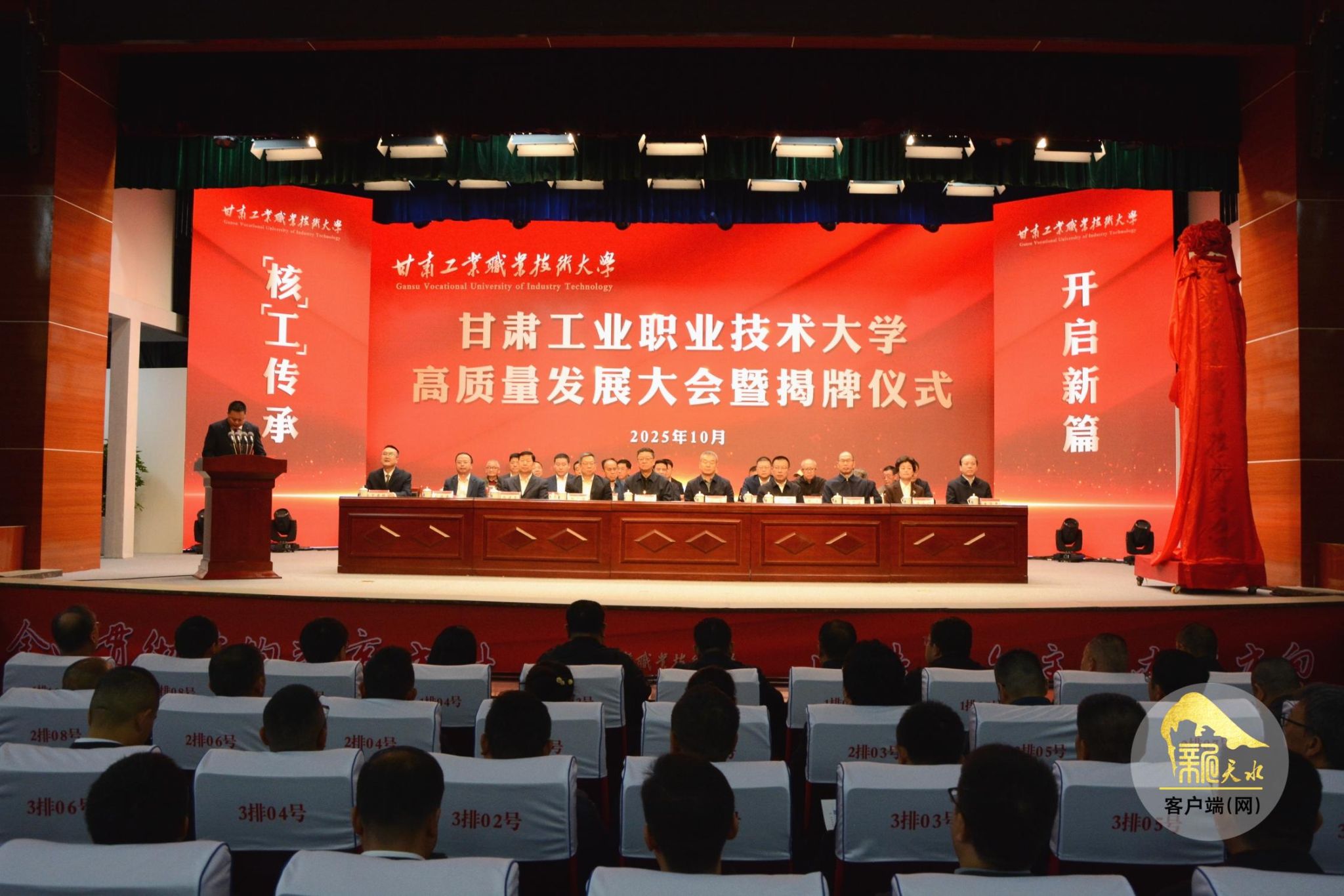 10月16日,甘肃工业职业技术大学高质量发展大会暨揭牌仪式举行。市委主要领导与工业和信息化部教育与考试中心、教育部学校规划建设发展中心、省教育厅相关领导共同为甘肃工业职业技术大学揭牌。省委机构编制委员会、省委军民融合办、市政府主要领导及分管领导、省职教协会以及兄弟院校代表、合作企业代表等出席揭牌仪式。