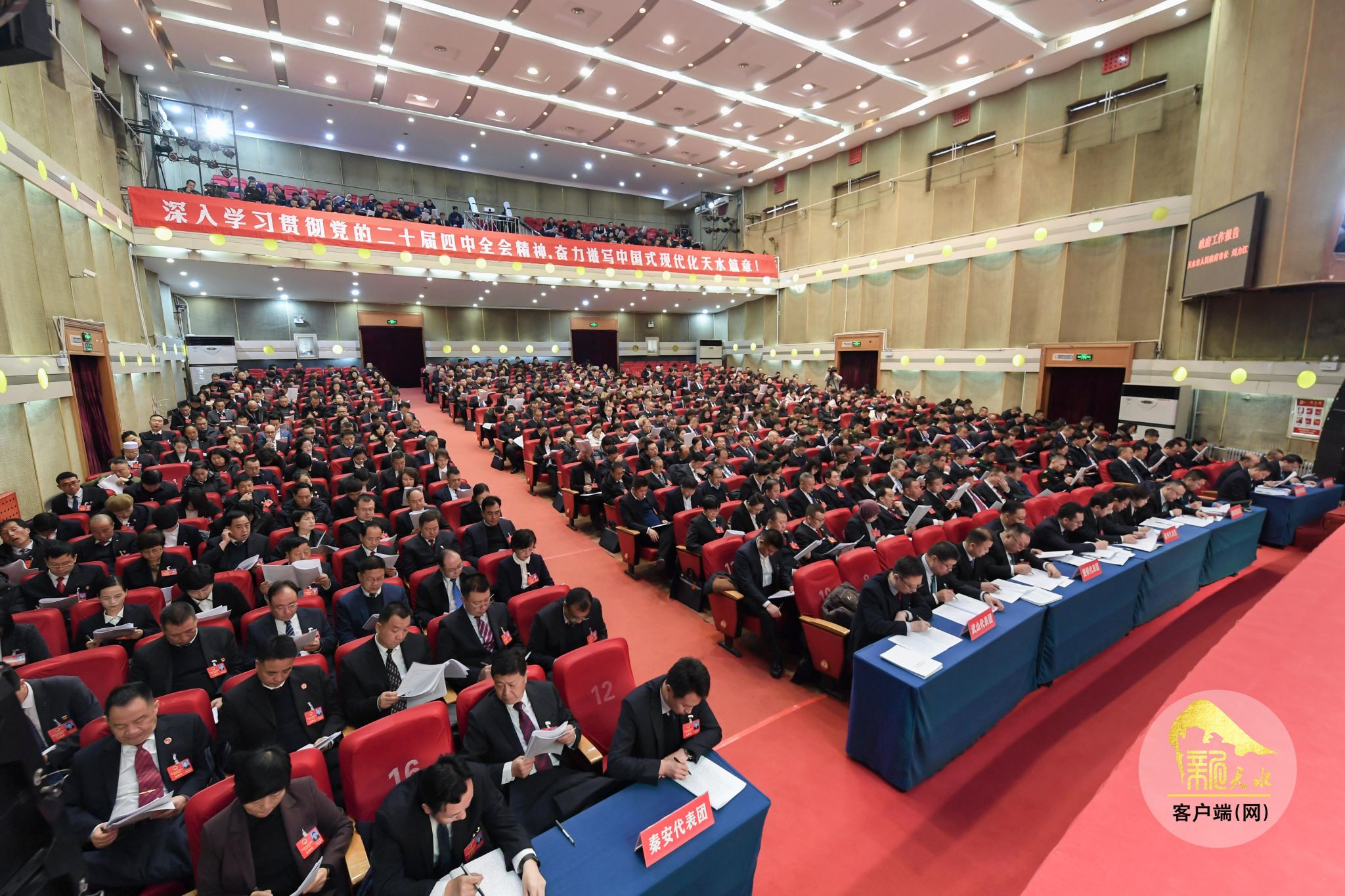 会场庄重简朴、气氛热烈。主席台帷幕正中的国徽在鲜艳的红旗映衬下熠熠生辉。会场内悬挂“深入学习贯彻党的二十届四中全会精神,奋力谱写中国式现代化天水篇章”的横幅标语,鼓舞人心、催人奋进。