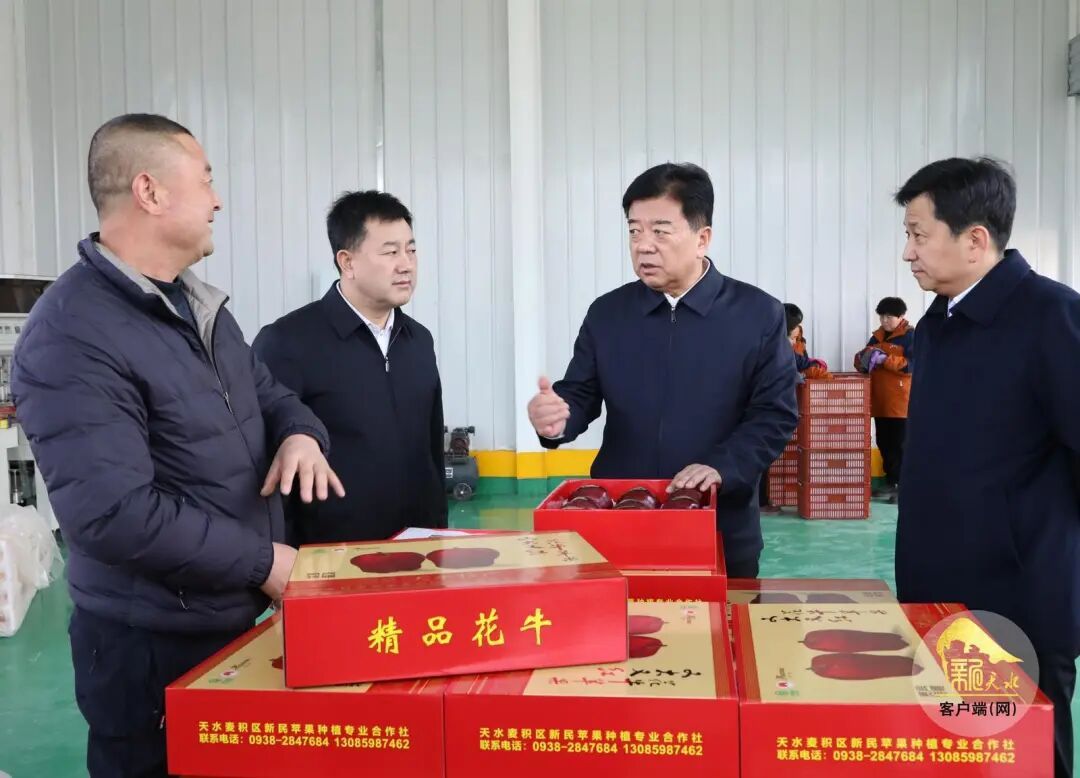 2月4日下午,市委书记杨金泉在麦积区专题调研花牛苹果产业发展情况。他强调,要深入贯彻落实习近平总书记视察甘肃重要讲话重要指示精神,牢记总书记视察南山花牛苹果基地时的殷殷嘱托,接续奋斗,感恩奋进,以科技引领促进花牛苹果产业全链条提升,持续擦亮花牛苹果品牌,带动更多群众增收致富。