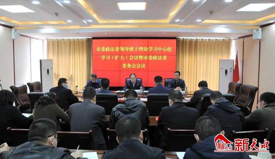 11月14日,天水市委政法委召开领导班子理论学习中心组学习(扩大)会议暨委务会会议,集中学习党的二十大精神和新修订的党章,学习习近平总书记重要讲话精神,传达学习中央和省、市有关会议、文件精神,研究贯彻落实意见。市委常委、政法委书记邵建斌出席会议并讲话。