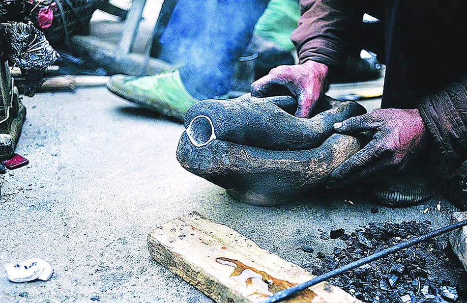看着渐趋旺盛的火势,吕忠孝老人的脸色也慢慢活泛起来。打铁之前,老人要给脚上绑块皮子,防止火星子烫脚。原来还要穿皮褂子、护胸,但现在已不多见了。