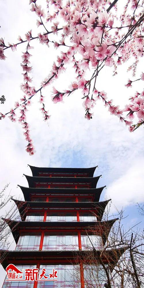 塔楼桃花相映红。
