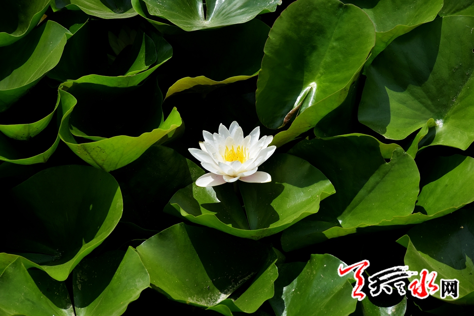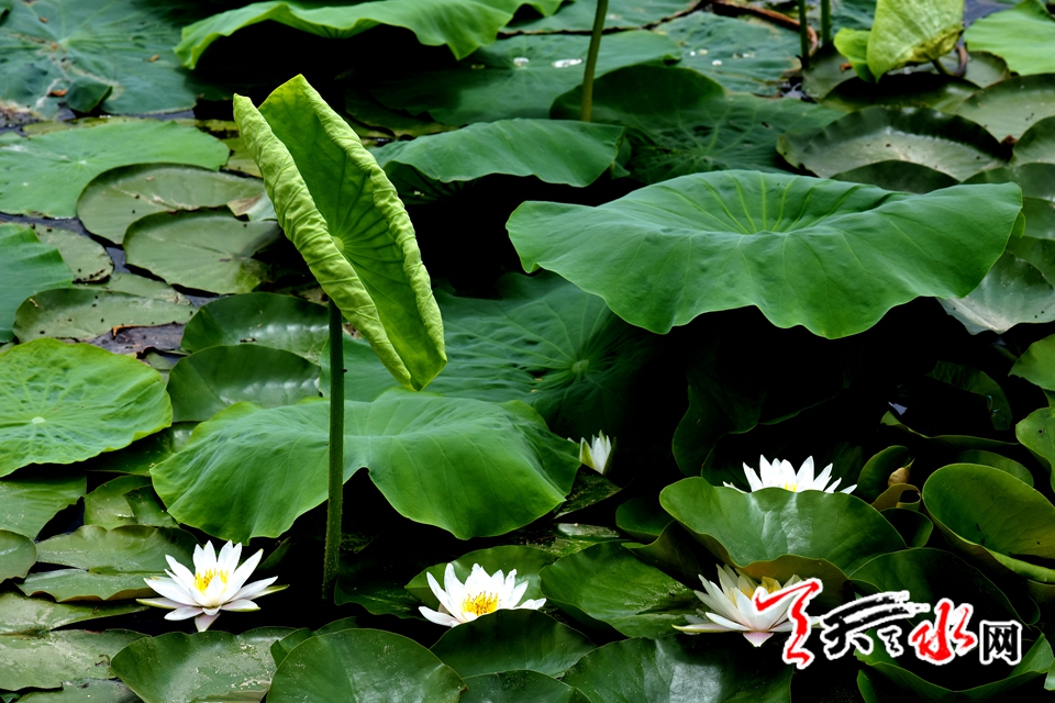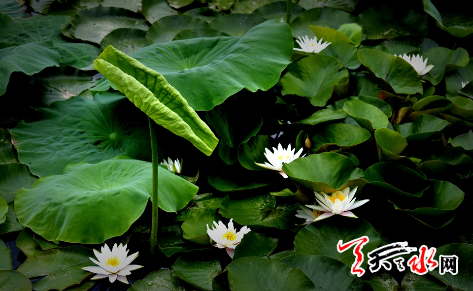 近日,天水湖一号坝区里的荷叶和睡莲迎来了盛开期,阳光下,一片绿油油莲叶上,白色的莲花星罗棋布地散开在其中,偶然见一两朵粉色点缀其间,显得格外抢眼,湖面清风过处,荷叶顺风齐摆,一幅夏荷清韵画卷徐徐展开,这时,盛夏的炎热顿觉随风而逝。(天天天水网 记者何永德摄)