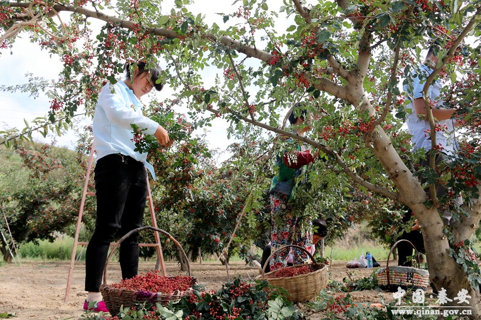 在王窑吕山村高绪生的花椒地里,20位采椒工正忙着采摘成熟的花椒,地上的蓝子里堆满了刚刚采摘下来的花椒。
